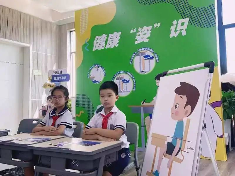在 “健康‘姿’识”展位上,孩子们坐在模拟课桌椅上,对照标准坐姿快检图,通过“坐于椅子上大腿与小腿垂直”“背挺直时上臂下垂其手肘在桌面以下3—4厘米”的自我监测原则,可以快速判断课桌椅高度是否需要调整。