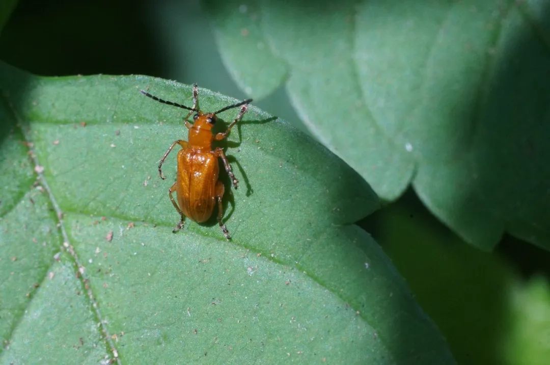 发现时间2024年6月10日。这种甲虫以其深褐色的体色和独特的习性而著称。负泥虫的幼虫会在身体表面覆盖一层粪便或泥土,以达到伪装和防御天敌的目的。这种行为不仅使它们难以被捕食者发现,还能提供物理防护,减少被寄生虫和病原体侵害的风险。