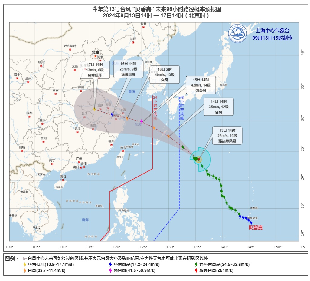 今天14时今年第13号台风“贝碧嘉”中心位于距离琉球群岛那霸市东偏南方向约 850 公里的太平洋洋面上(23.6 °N、135.6 °E),距离浦东南汇嘴约1570公里,强度为强热带风暴级。