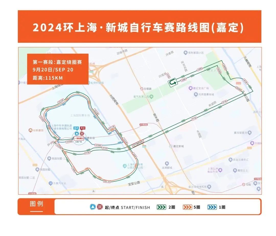 9月20日第一赛段将在嘉定新城举行,全程约115公里,将从上海国际赛车场出发,7时30分至13时,自行车赛途经的内环西路—内环北路—内环东路—环东三路—外环东路—安辰路—规划二路—规划三路—安晓路—伊宁路—德立路—远香湖路—白银路(合作路折返)—白银路—裕民南路—伊宁路—外环西路—环西五路—内环西路—一号检票口(终点),在运动员临近时实施交通管控措施。