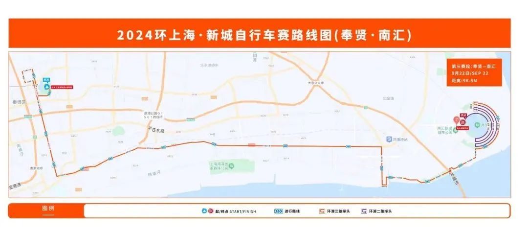 9月22日第三赛段将从奉贤新城至南汇新城,全程约96.5公里,0时至12时,自行车赛途经的上海之渔湖畔路—秀竹路—金海公路—东方美谷大道—望园路—树贤路—金海公路—港漕公路—两港大道—南芦公路—海塘大堤—杭湾路—世纪塘路—南港大道—环湖南三路—环湖东三路—环湖北三路(乔柏路折返)—环湖北三路—环湖东三路—环湖南三路右转—南港大道右转—环湖南二路—环湖东二路—环湖北二路(乔柏路折返)—环湖北二路—环湖东二路—环湖南二路右转—南港大道右转—环湖南一路—环湖东一路—环湖北一路—滴水湖地铁站(终点),在运动员临近时实施交通管控措施。