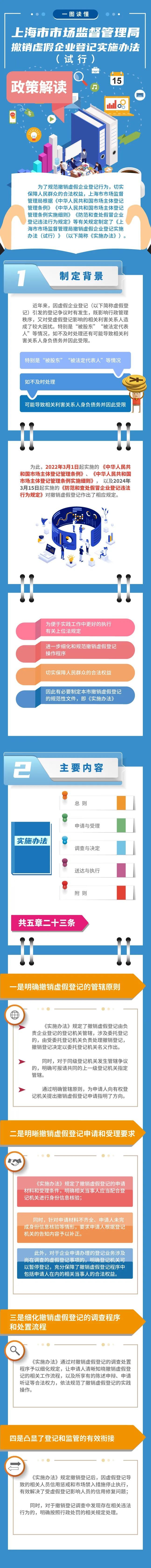 为了规范撤销虚假企业登记行为,切实保障人民群众的合法权益,上海市市场监督管理局制定了《上海市市场监督管理局撤销虚假企业登记实施办法(试行)》,包括总则、申请与受理、调查与决定、送达与执行、附则等共5章23条。来看解读↓