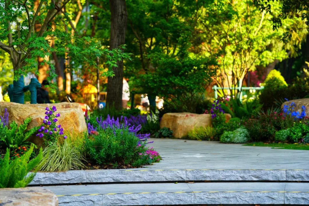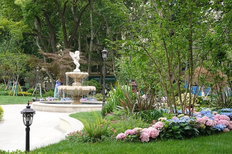 花园设计以“水漾”为主题,设置衡复印象、波光潋滟、镜湖草坪、绿树成荫四大景观分区,通过太阳光照效果营造各分区的不同氛围。公园以开阔的大草坪为底色,以木绣球、绣球与圆锥绣球为主题花卉,搭配百子莲、薰衣草等紫色系植物,突显衡山路独特的典雅气质。