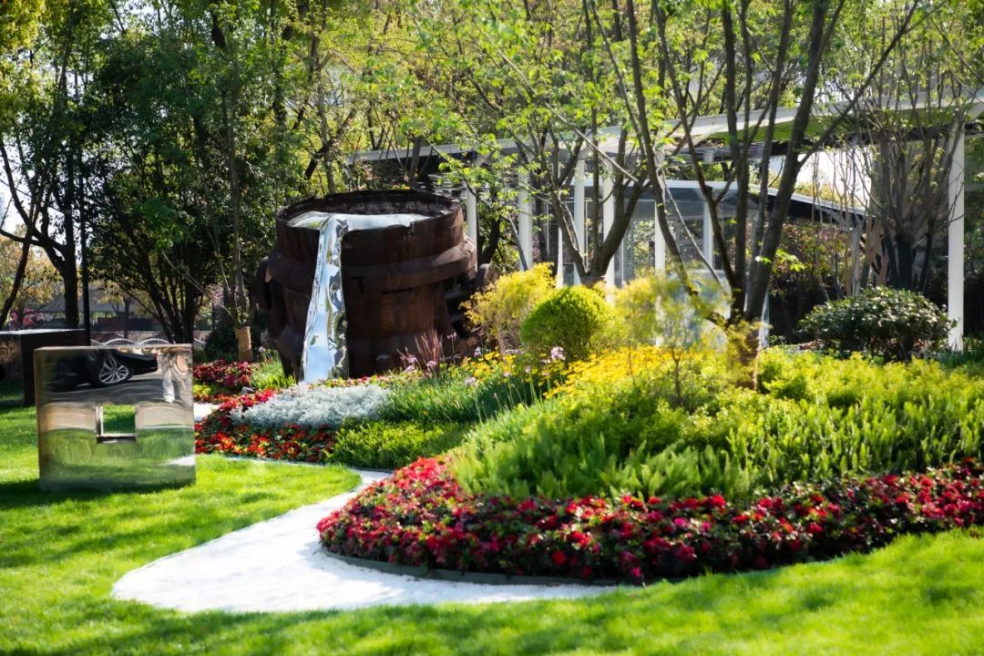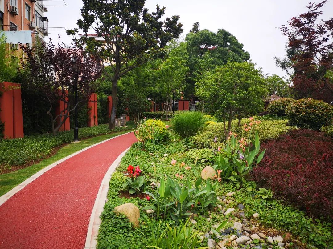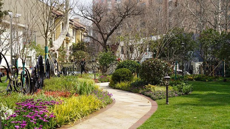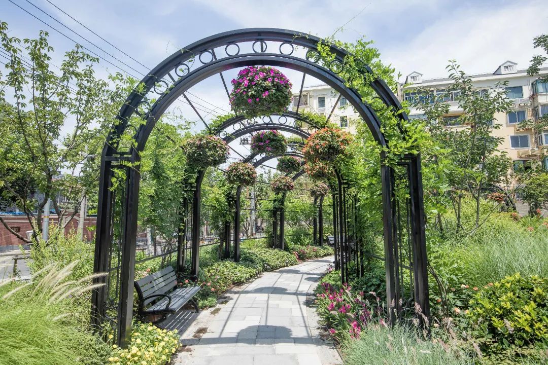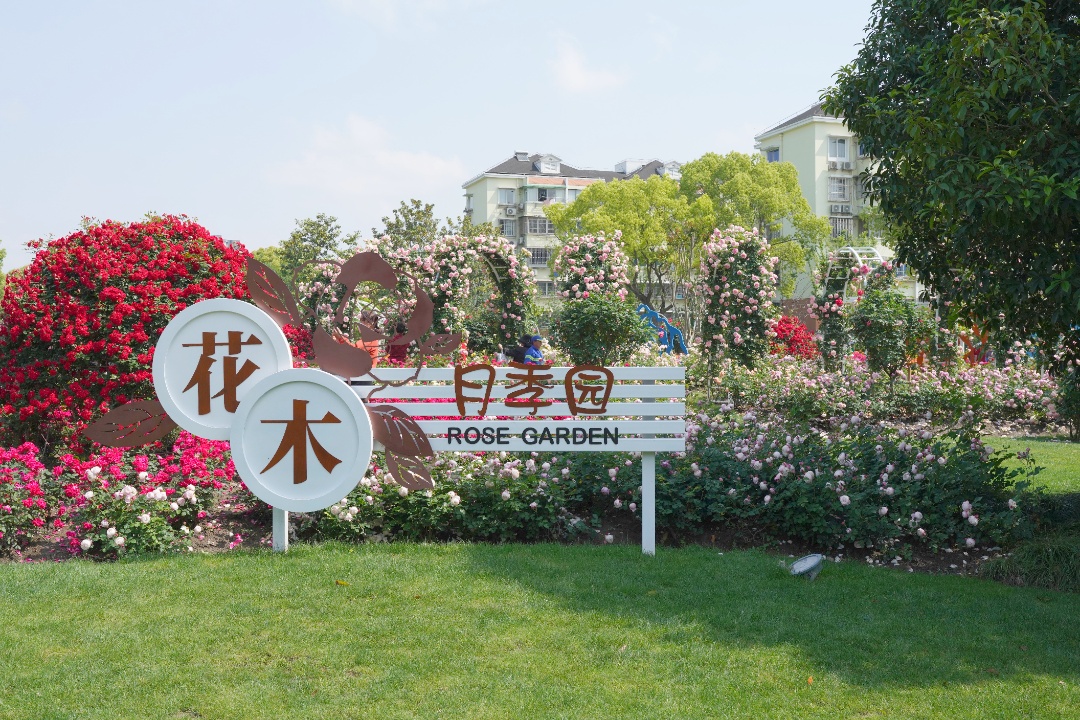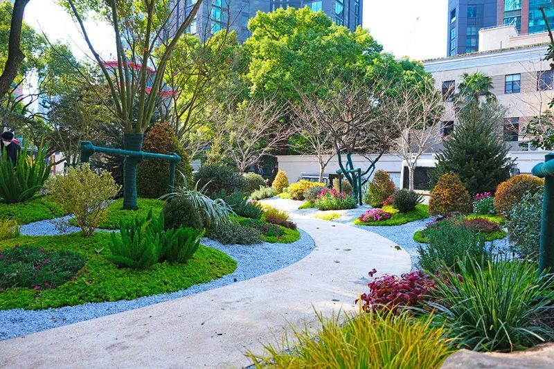 绿地整体采用英式花园设计手法,营造“通往回家之路”的氛围与情怀,植物搭配以市花白玉兰、月季以及紫、粉、白三色长穗紫藤为主打花卉,以开花色叶乔木为骨架,中下层辅以自然式花境,近50个品种的特色花境植物丰富了园内的景观效果。