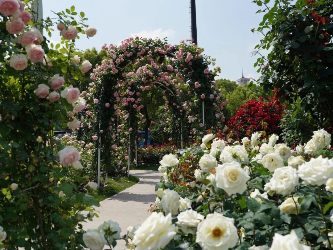 入口处设计了标志性景观花坛、铁艺雕版月季图案以及藤本月季拱门等特色设施,并在院内北区设置了健身月季廊和弯月休息区。园内种植藤本月季、灌木月季、丰花月季、树状月季与大花月季等不同形态的众多新优品种月季,营建了一处老少皆宜的赏趣月季园。