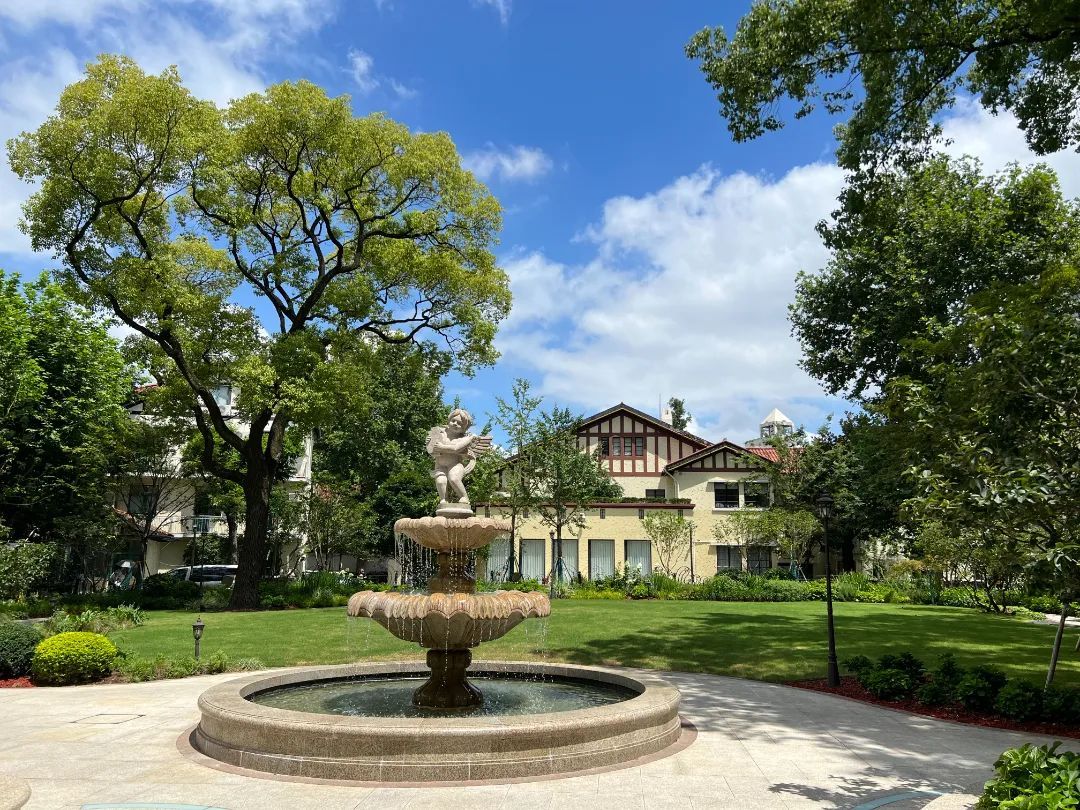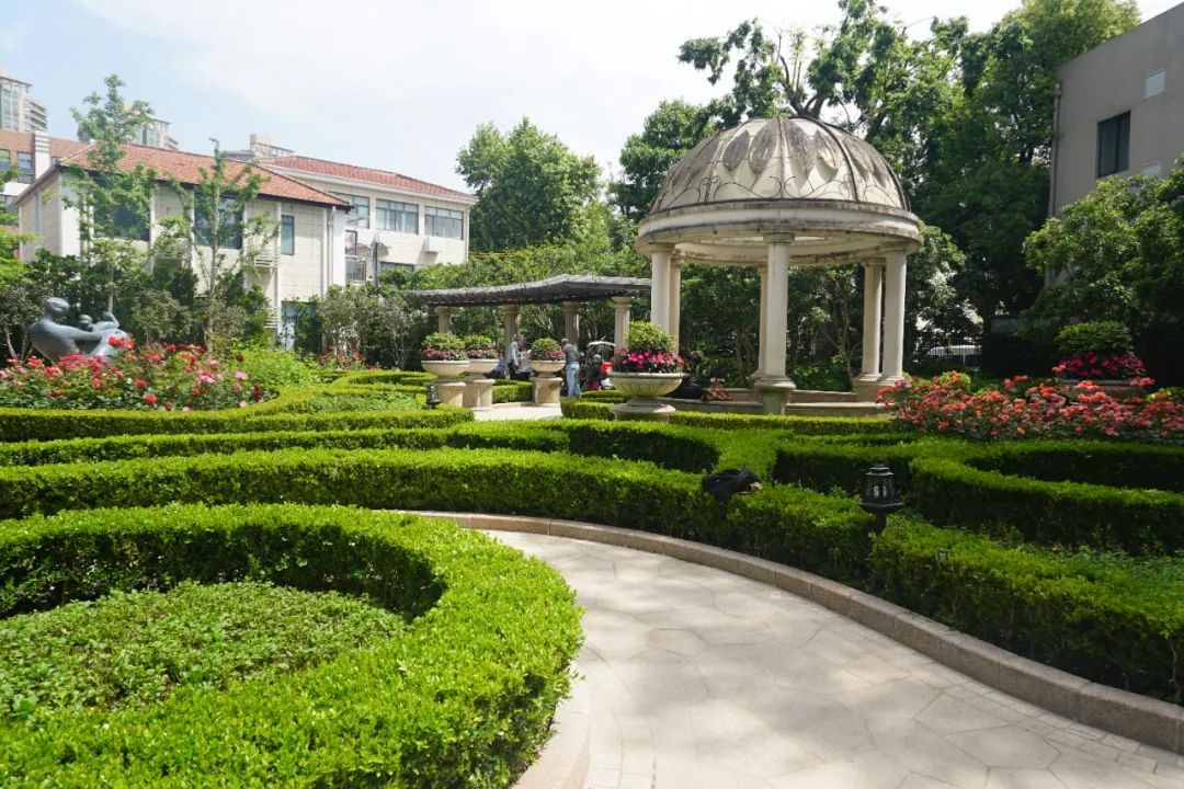 公园内有复建的白马咖啡馆和喷泉雕塑《风雨同舟》,通过朴实、细致的景观设计,利用花境点缀,展现了上世纪二、三十年代的上海庭院风格。