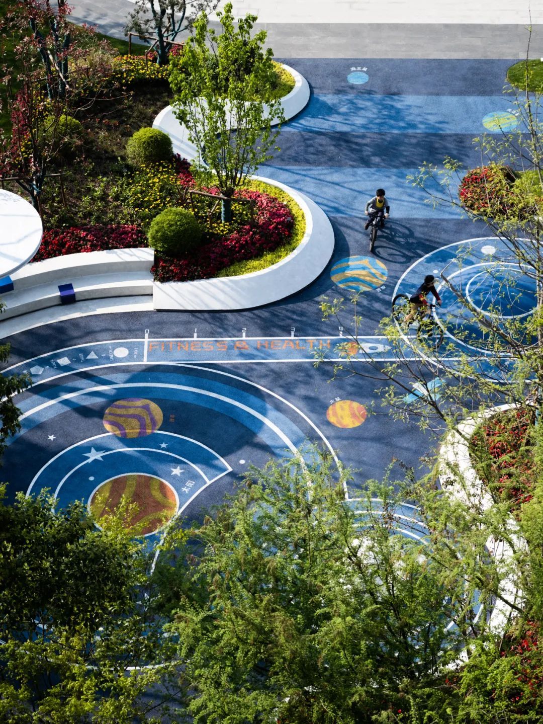 镜花园专辟了300平方米的儿童活动广场,以“宇宙空间”为设计主题,为儿童提供了户外科普阵地。绿地选用海棠、三角枫等,搭配花境植物共同营造“春天海棠花开,秋天红叶片片”的植物意境。