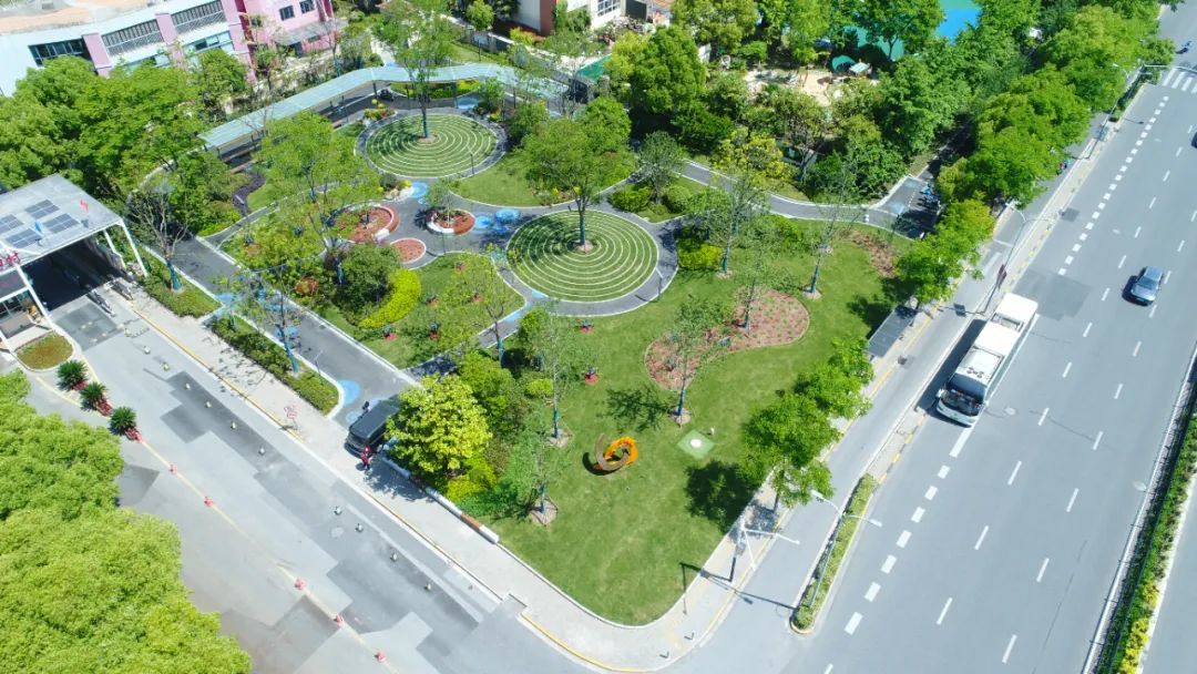 临蒙花园位于蒙山路沪杭公路路口,面积3600平方米。改造打开了原本郁闭的绿地空间,巧妙融入了现代园林设计元素——庭院灯、亭廊架、圆形铺装场地以及休憩设施,为居民们提供了活动场地、休闲观景等多种类型的活动空间。