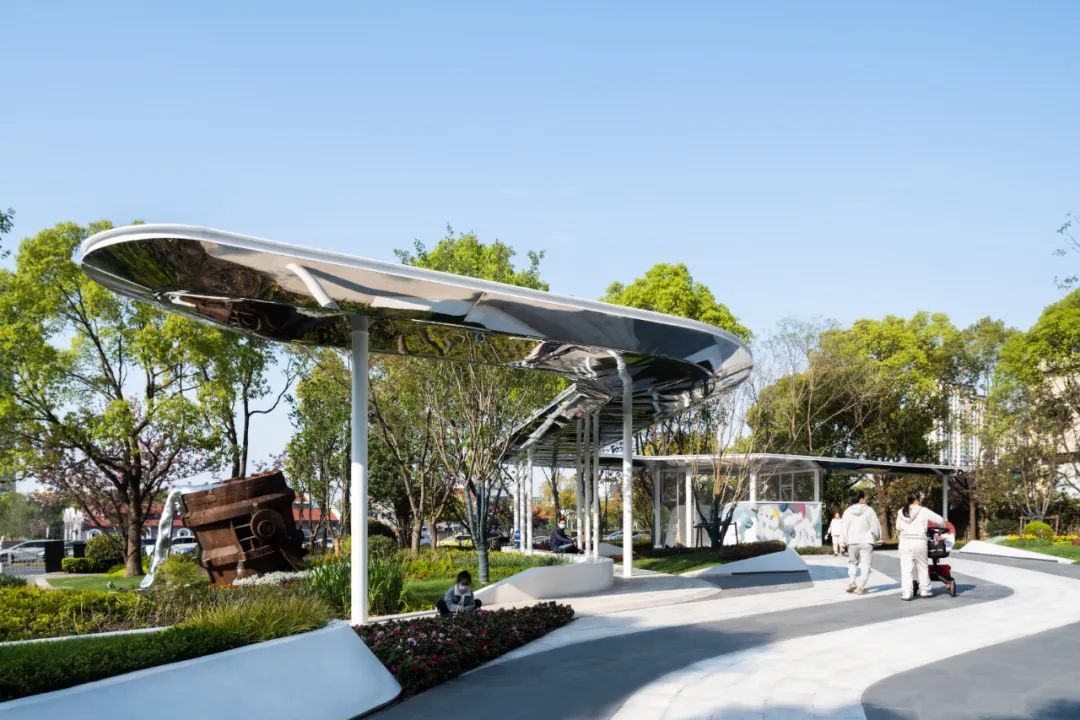 泽园设置入口广场、休闲草坪与小剧场三处活动空间,其中北侧写有“泽园”的入口小景与西侧的白色园艺拱门是拍照打卡的首推点。园内种植了特色本土植物用于展现秋叶、秋花、秋果的秋色魅力,并安装足量木桩凳、石凳、长凳以满足市民的休憩需求。