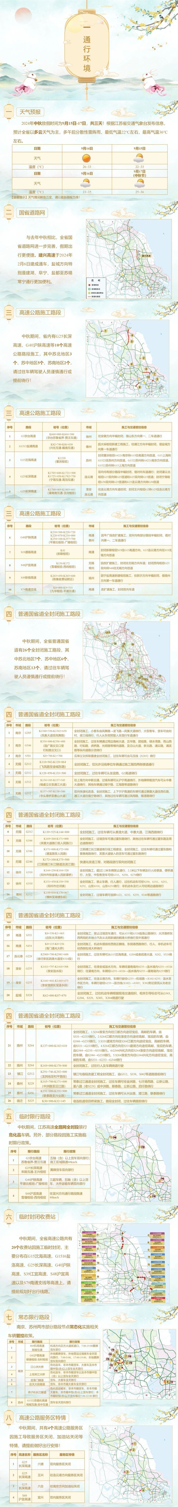 温馨提示,假期高速公路七座及以下小型客车通行不免费。此外,全省普通国省道有26个全封闭施工路段,其中苏北地区7个、苏中地区6个、苏南地区13个,请过往车辆驾驶人员谨慎通行或提前绕行。