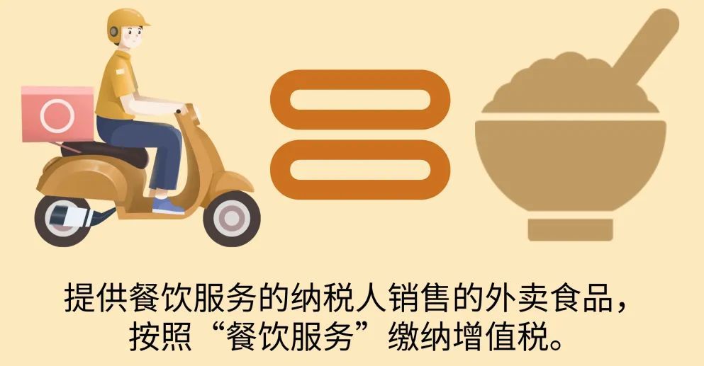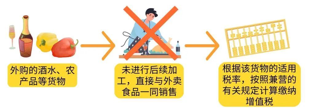 本条政策明确,餐饮企业销售的外卖食品,与堂食适用同样的增值税政策,统一按照提供餐饮服务缴纳增值税。以上“外卖食品”,仅指该餐饮企业参与了生产、加工过程的食品。对于餐饮企业将外购的酒水、农产品等货物,未进行后续加工而直接与外卖食品一同销售的,应根据该货物的适用税率,按照兼营的有关规定计算缴纳增值税。