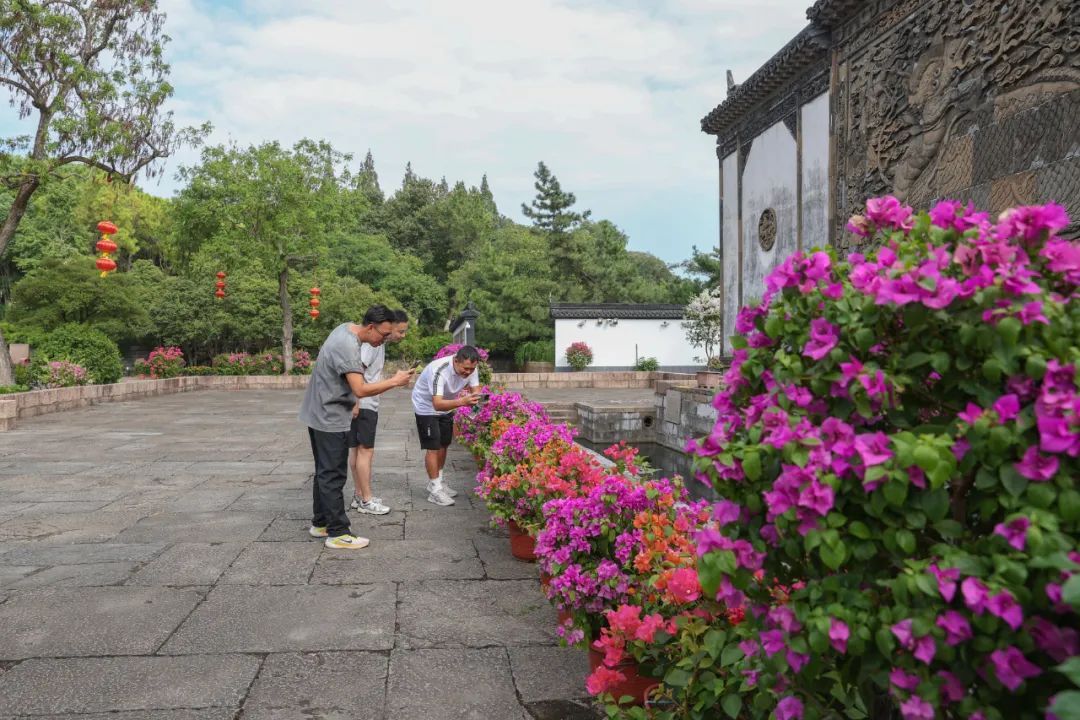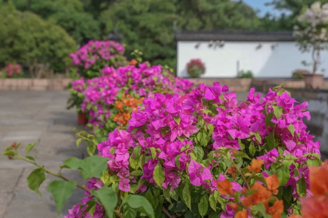 三角梅盆栽被精心布置于园内主要景点,包括北大门甬道、方塔广场、东大门、五老峰等。此次展出大、中、小型三角梅品种多达30余种,有绿樱、云南紫、中国红、重瓣红、爱马仕橙、加州黄金、白雪公主等,花色繁多,各具特色。特别引人注目的是几株混色花柱三角梅,高度超过2.5米,格外壮观。“三角梅很漂亮,式样多,好多品种我都没见过。”游客刘女士一边拍照一边赞叹。