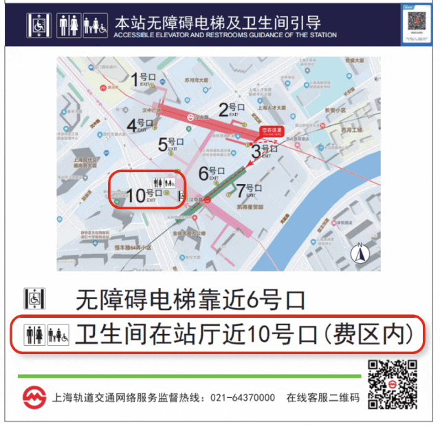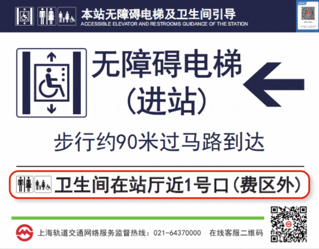 综合服务信息牌版面新增车站卫生间的位置指引,并标注卫生间位于费区内或费区外,便于乘客选择。