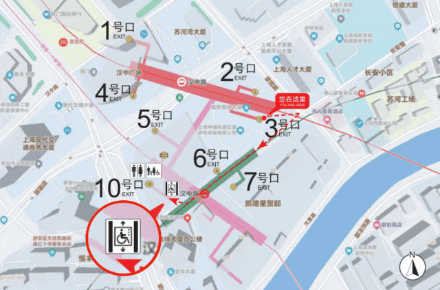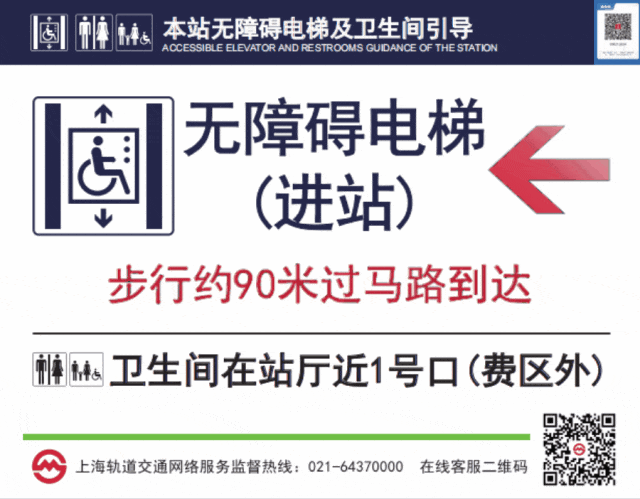 对于临近无障碍电梯的出入口,则直接使用箭头指引方位,并增加距离指示。