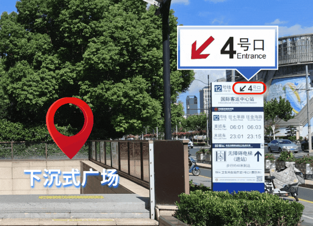 针对在下沉式广场内的出入口,在地面位置增设导向箭头,给予乘客更明确的空间方位,比如位于“双狮汇”下沉式广场内的12号线国际客运中心站4号口。