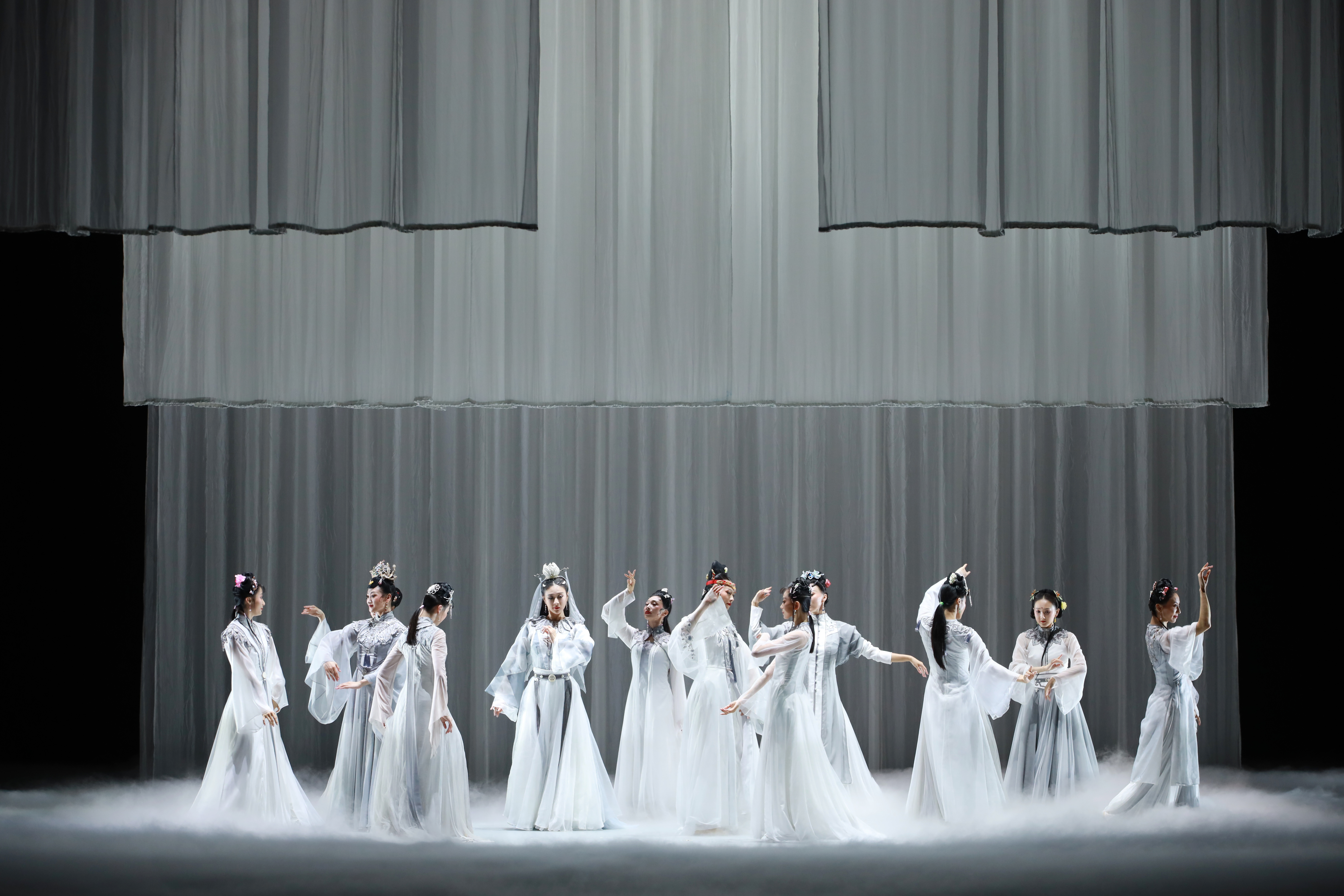 舞台上,舞者们身着华美的服饰,以轻盈曼妙的舞姿生动再现了《红楼梦》中的经典场景——“入府”“幻境”“省亲”“游园”“葬花”等,将原著的精髓凝聚于一座舞台之上。观众仿佛穿越时空,与贾宝玉一同入梦,共同领略十二金钗的人生百态,感受那份极致的东方美学韵味。