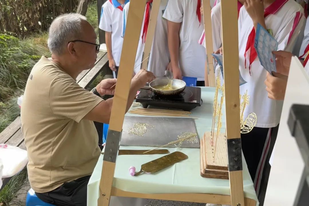 一块石板、一锅糖浆、一把竹签,靠着手艺人的精准把控,凤凰、飞龙等生动图案逐渐在石板上显现。非遗体验区域内,草编飞鸟、创意捏面人、扎染拓印等花样繁多,专业老师手把手制作的手工艺品件件精致,吸引了不少同学围观。