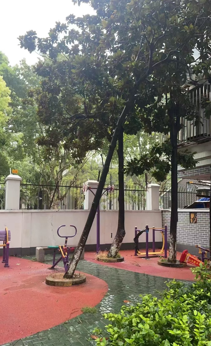 镇北居民区也有情况发生,小区健身区域的一棵广玉兰树已被大风吹歪,随时有倾倒的可能,存在安全隐患。镇北居委干部和社区工作人员第一时间对树木进行了加固并在巡防中对其加强检查。