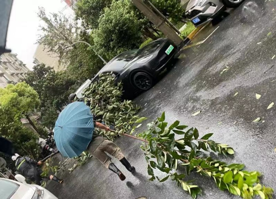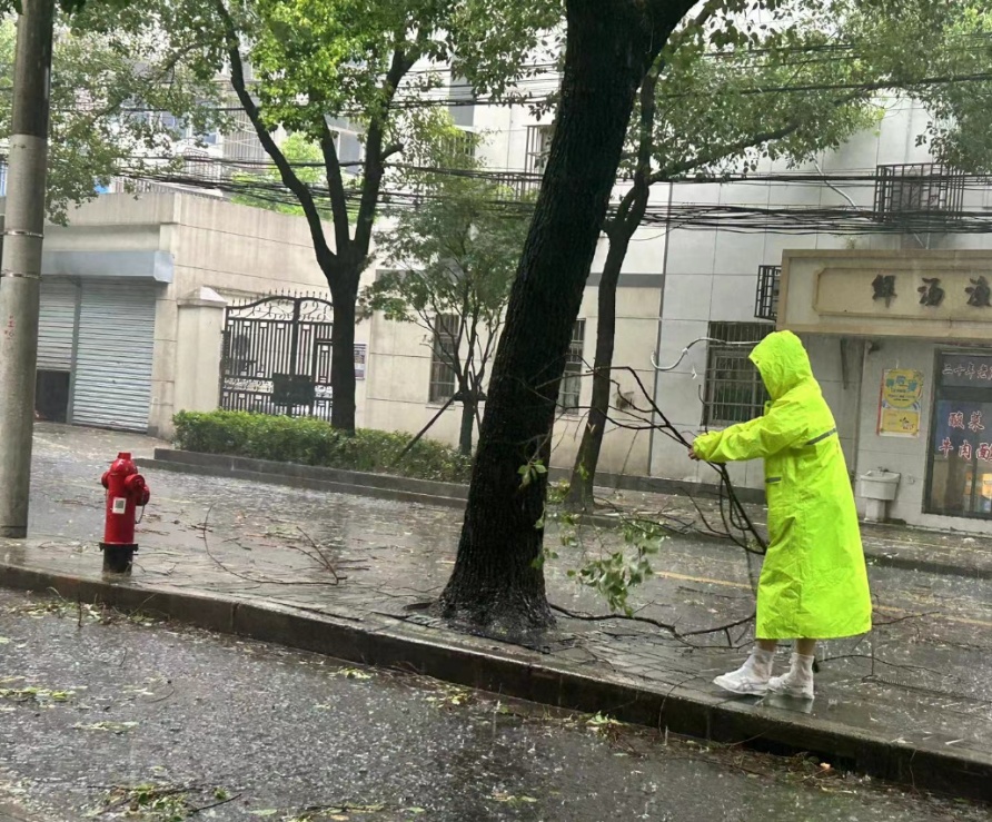 今天上午9点多狂风骤起,江湾镇街道虹馥居委书记张亚燕和居委干部还有物业保安队长巡查小区时发现一棵树已经被大风吹倒,并占据了部分小区主干道,大家立马齐心合力把倒伏的树木移至了安全的区域,保障了居民们的出行安全。