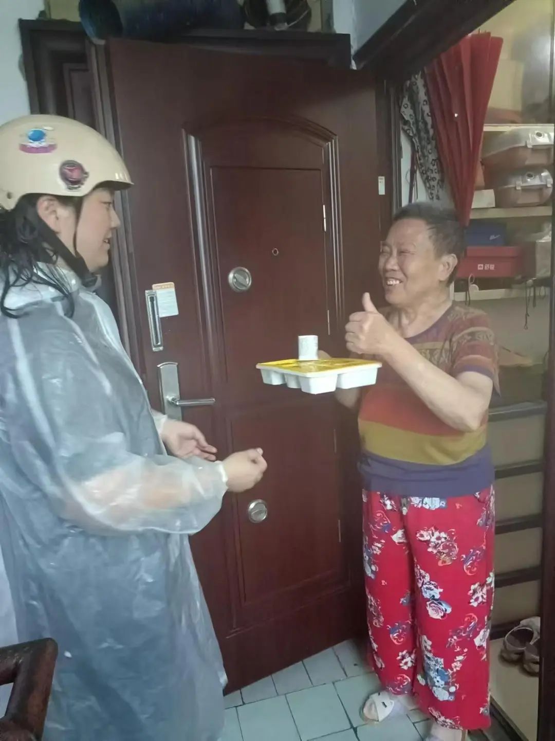 在万里街道,大风大雨之下,独居老人用餐成了难题。眼看风雨不停,还越来越大,街道社区食堂经理郭英地,立即捧起装着餐食的保温餐盒,开着助动车上门送餐。“周阿姨,我给你们送午饭来了。”上午10点40分,郭英地冒着风雨送完了老人的午餐,尽管穿着雨衣,但还是浑身湿透。拿到透着热度的餐盒,老人都感动不已。“谢谢你,冒着大风大雨为我们送餐。你要注意安全啊!”