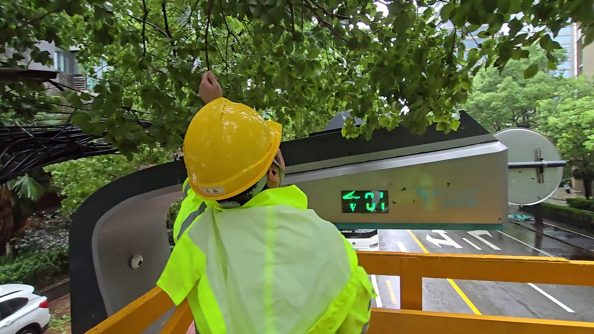 接到紧急报修通知后,久事公交集团下属现代交通公司的抢修队伍火速响应,抢修车辆如离弦之箭般奔赴现场。抵达后,抢修人员迅速就位,利用升降平台升至高空作业区域。经过细致勘查,他们发现树枝与充电桩的缠绕情况并不复杂,遂决定采用钢锯小心翼翼地截断树枝,随后将其移除,并对充电桩表面进行了彻底清洁,确保无任何残留物影响使用。据抢修人员介绍,930路线所采用的智能柔性充电弓具备高度智能化特性,能够实时监控充电状态。一旦充电弓表面附着如枝叶、柳絮、灰尘等异物,导致温度、压力等参数异常,系统会立即自动断电,以保障安全。