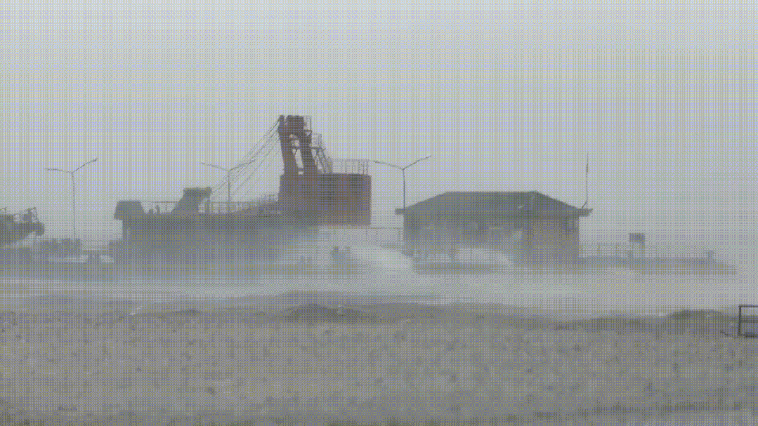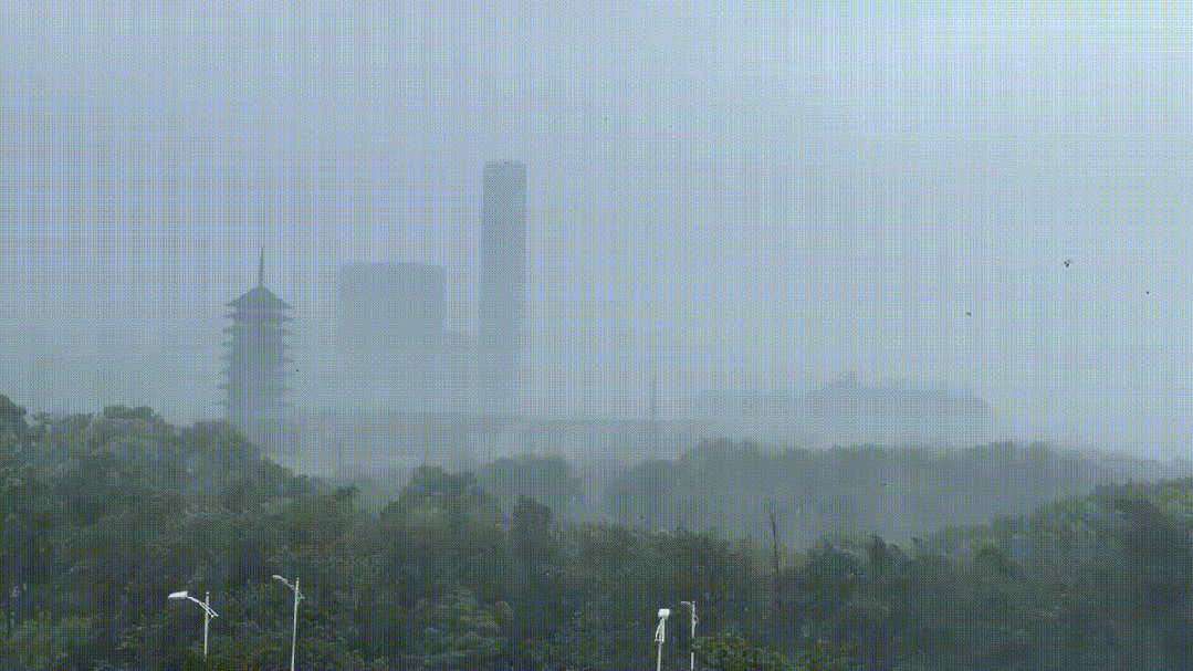 远处,宝山区的标志性建筑物“金箍棒”和“宝塔”在水雾的迷漫中若隐若现,能见度不足五百米。码头周围的设施、树木在狂风中剧烈摇曳,天空低沉,乌云密布,被吹落的树枝、树叶在空中盘旋的场景增添了几分惊心动魄的气息。