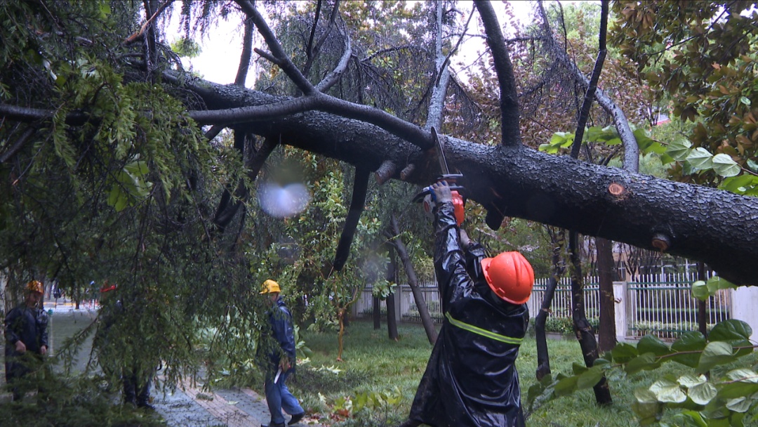下午四点,记者在叶城路普惠路口附近看到,工作人员井然有序地在街道上忙碌着。他们以小组为单位,使用电锯将倒伏的大树逐段锯开,按照树干的大小和形状分类堆放。