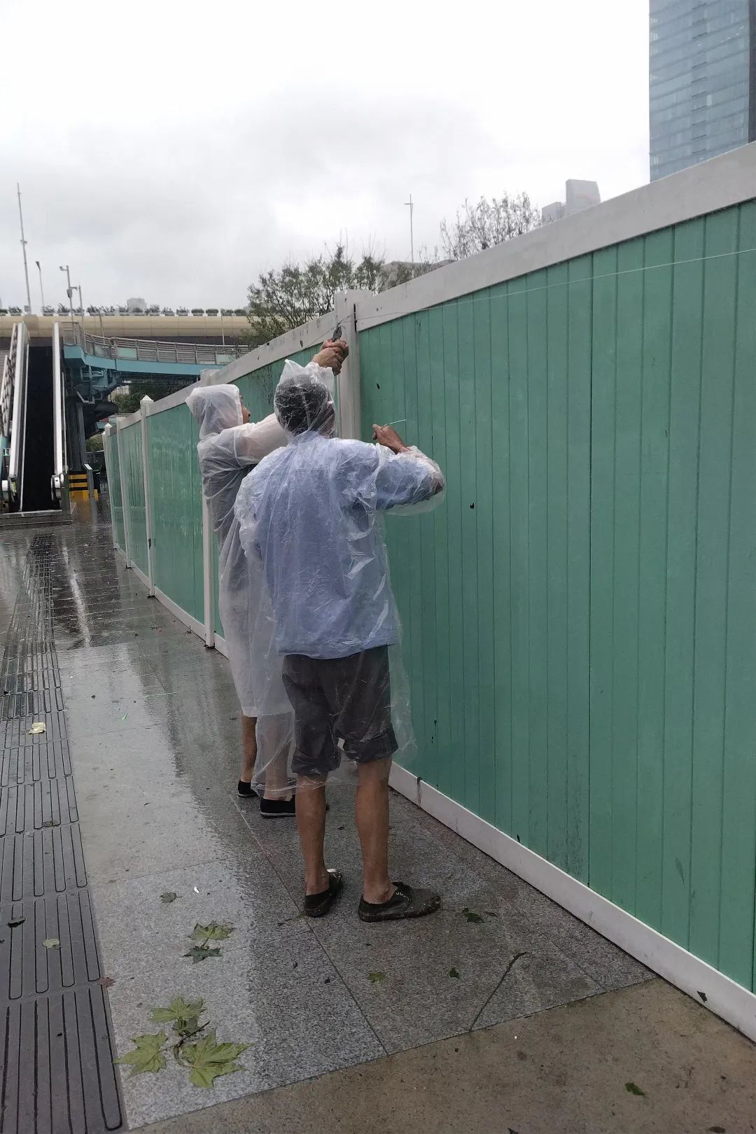 静安寺街道城管社区工作室青年突击队的队员们迎风而上,冲锋在前,第一时间对建筑工地进行细致巡查,确保施工设施牢固稳定,提醒施工人员加强安全防范。