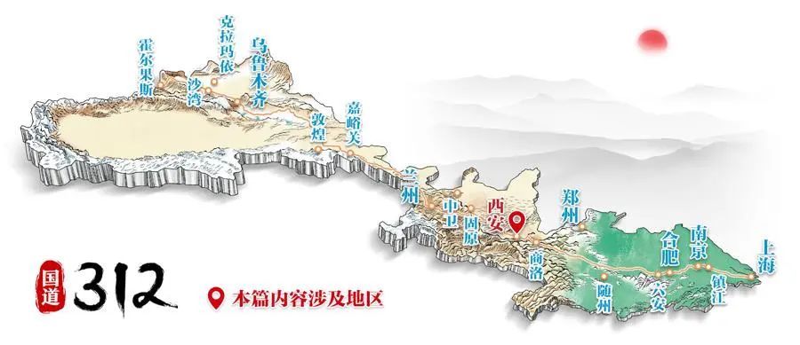 起点在上海,终点是新疆霍尔果斯,312国道全程4967千米,经过上海、江苏、安徽、河南、湖北、陕西、宁夏、甘肃、新疆九省区,是贯穿东西的一条经济大动脉,也是东西部协调发展的一条重要纽带。