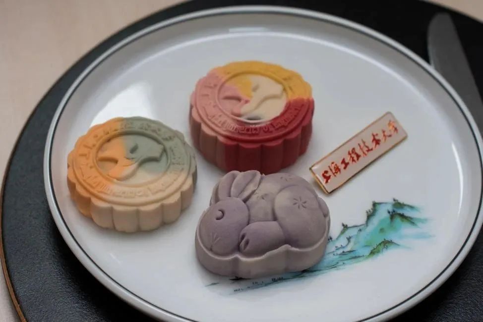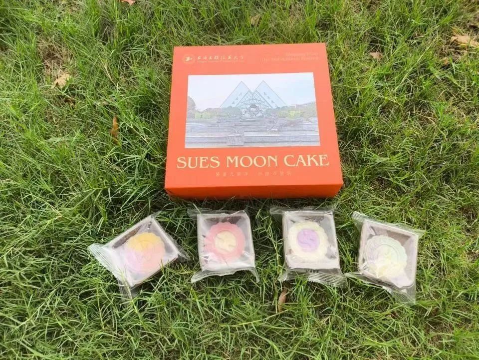 上海工程技术大学今年推出广式和苏式两款月饼,轻咬一口,满齿留香。同时,学校在定制的月饼礼盒中,融入“校徽”、校园标志建筑元素,承载着学校满满的心意和创意。