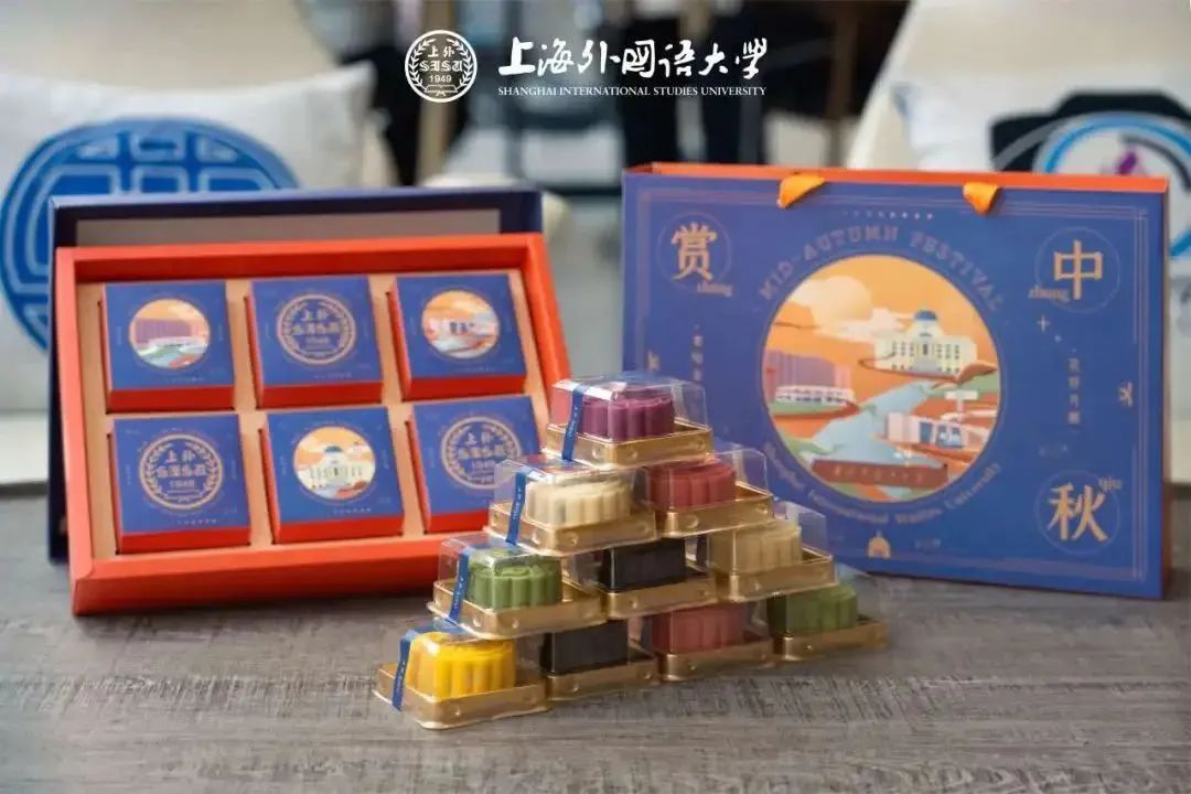 不仅月饼口味升级,上外的月饼礼盒也大变身,采用“上外蓝”和“贵气橘”的组合,礼盒设计有学校标志性建筑、河道绿植、以及“校宠”天鹅,细节之处蕴藏校园独特文化韵味。