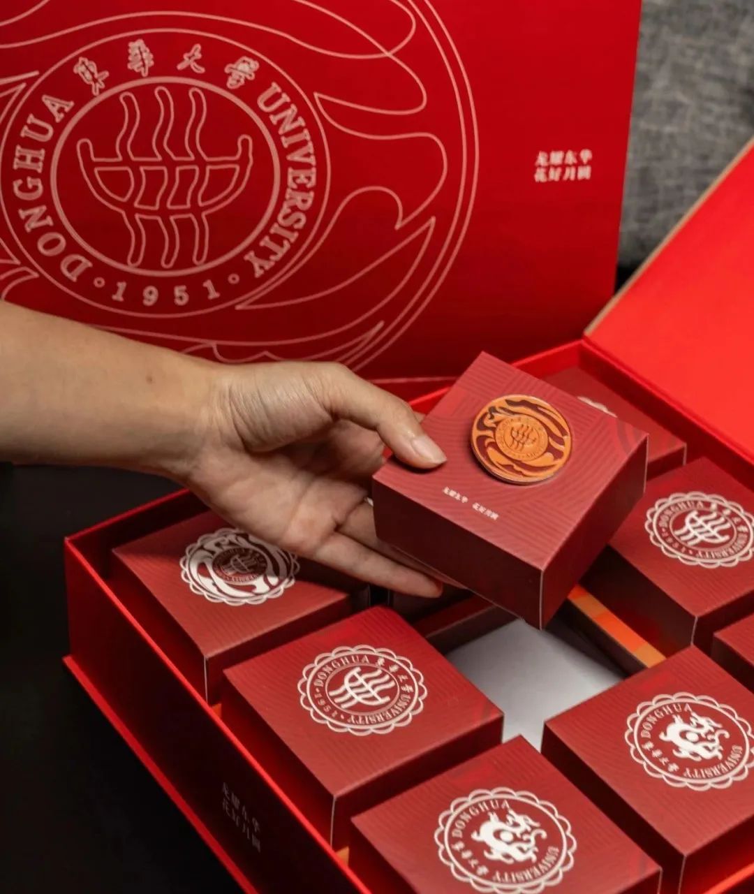 值得一提的是,今年学校除了推出一系列精美的月饼,还推出了甲辰龙年中秋月饼礼盒,礼盒中龙耀东华徽章也是龙年限定的。