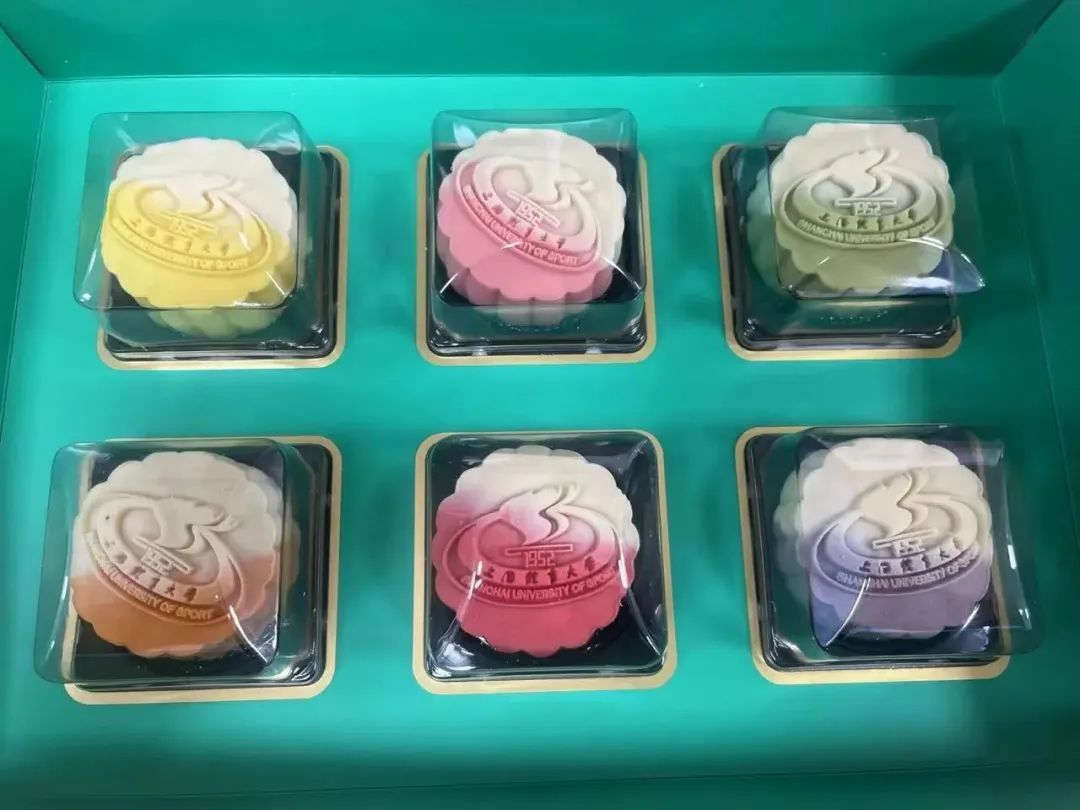 上海体育大学推出苏式月饼、广式月饼以及桃山皮流心月饼,其中,苏式月饼上印有馅料口味,简单醒目,另外两种则印有学校的校徽,让学子在月饼里找到香甜的归属感。