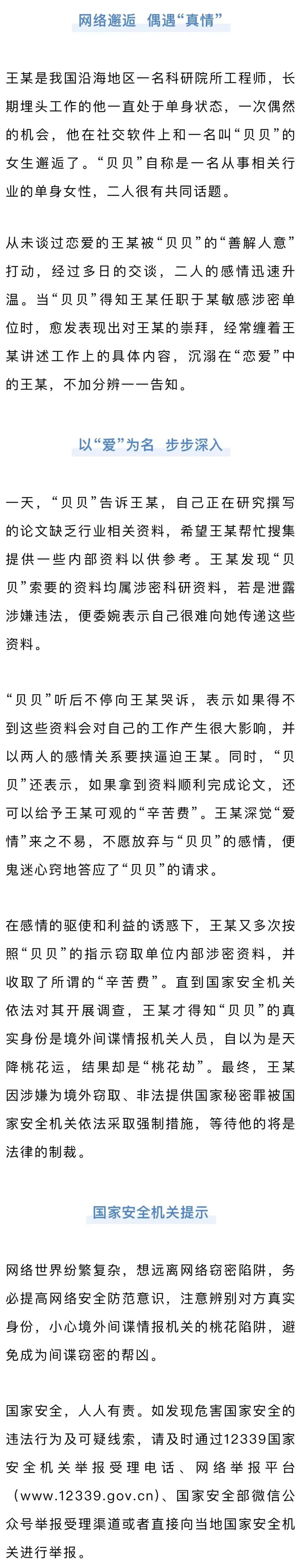 近年来,国家安全机关工作发现,境外间谍情报机关以网恋交友为突破口,精心伪装身份,制造“有缘邂逅”,编织甜蜜陷阱,妄图借此拉拢策反我境内人员,窃取我国家秘密、危害我国家安全。