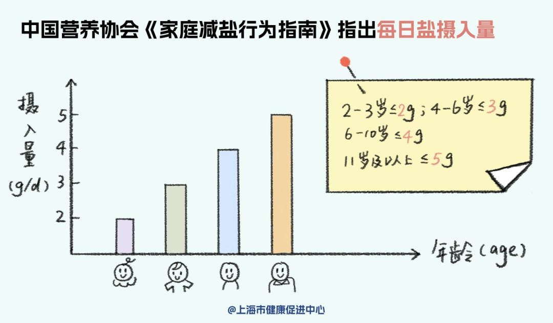 11岁及以上儿童和成年人,每天摄入食盐不超过5克。