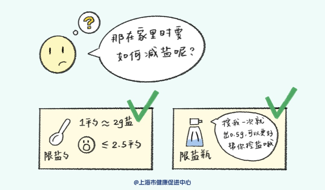 建议家中配备定量盐勺、盐罐等减盐工具,控制每天食盐摄入量。