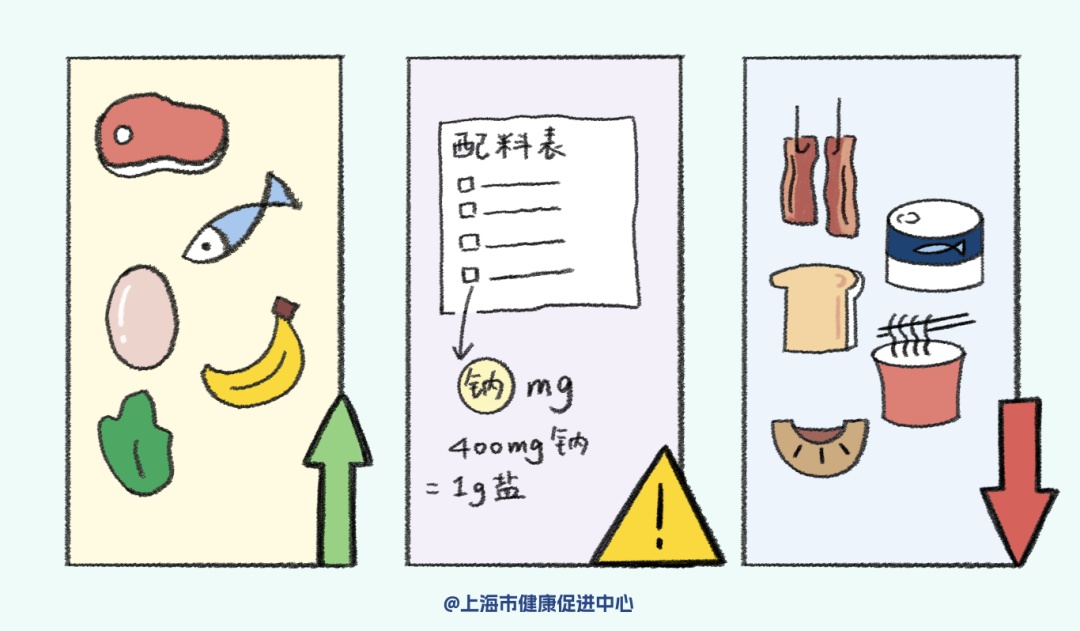 尽量少买钠含量高的酱腌菜、腌腊肉制品、蜜饯等食品;