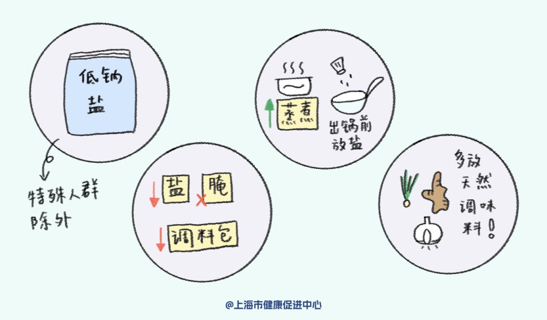 宜选择低钠盐替代普通食盐(高温作业者、重体力劳动强度工作者、肾功能障碍者及服用降压药物的高血压患者等不适宜高钾摄入人群除外);
