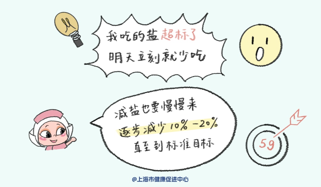 根据家庭成员当前的食盐摄入量情况,如摄入超量,应通过设立目标值逐步减盐。