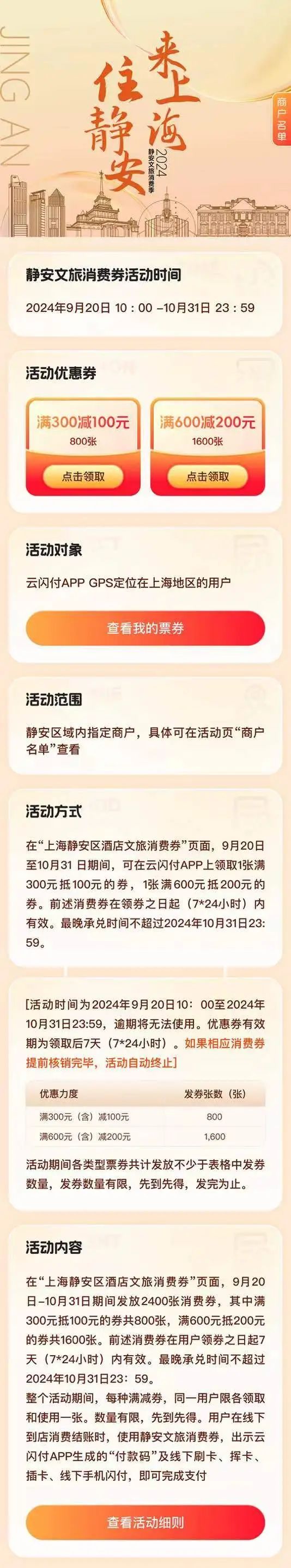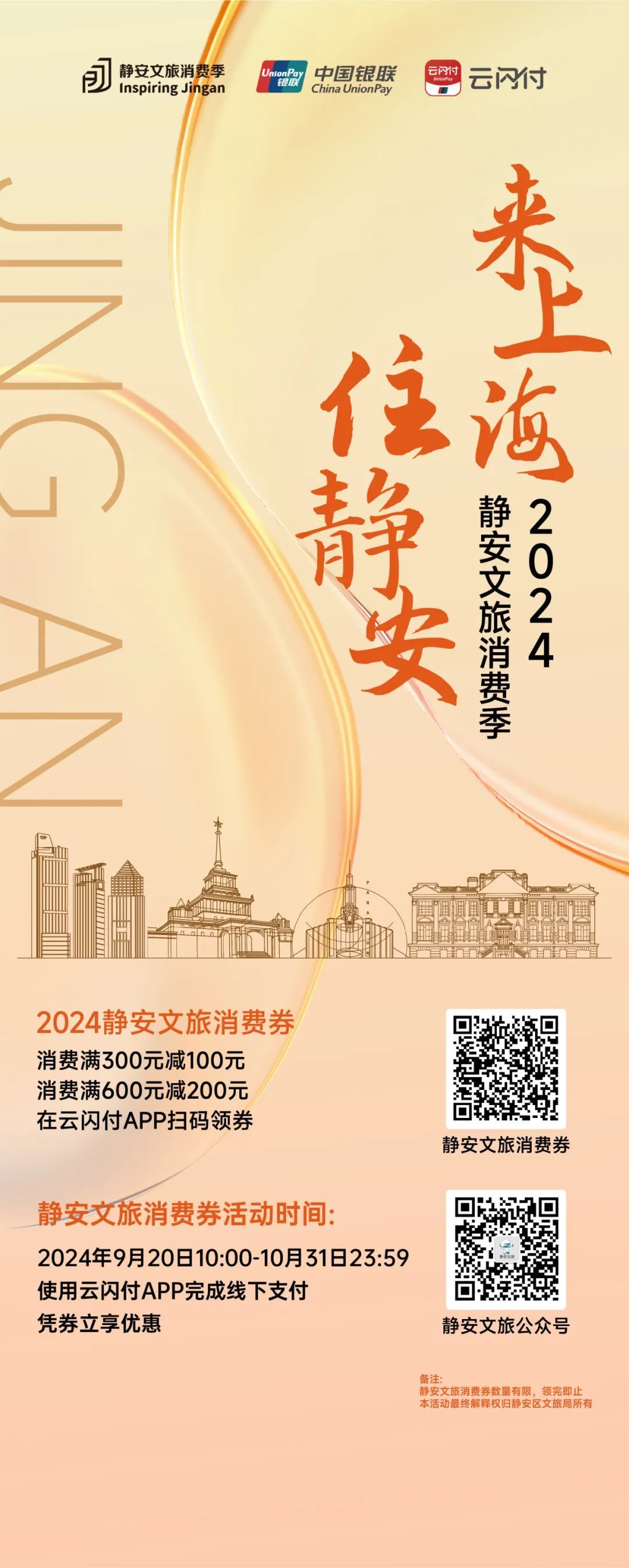 2024年静安文旅消费季期间,区文化旅游局投入真金白银,实现消费惠民。9月20日10:00—10月31日23:59,用户通过银联“云闪付App”专项页面,均有机会领取一张满300元减100元、一张满600元减200元的静安文旅消费券。凭券在静安区内参与文旅消费季活动的酒店商户及其自营餐厅等场景内使用,可实现自动抵扣。