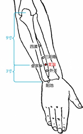 支沟穴:属手少阳三焦经,位于前臂后区,腕背侧远端横纹上3寸,尺骨与桡骨间隙中点。快速取穴:拾臂俯掌,掌腕背横纹中点直上4横指,前臂两骨头之间的凹陷处即是支沟穴,是治疗便秘的常用穴位。