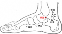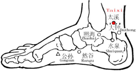太溪穴:属足少阴肾经,在足内侧,内踝后方,当内踝尖与跟腱之间的凹陷处。太溪穴滋阴清热、益肾安神,可治疗热病烦心、失眠和咽喉不利。快速取穴:坐位垂足,由足内踝向后推至与跟腱之间凹陷处即是太溪穴。