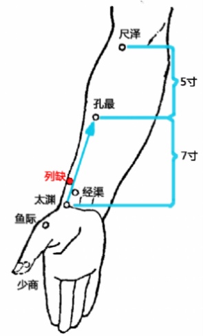 列缺穴:两手虎口交叉,用一手食指压在另一手的桡骨茎突上,当食指尖端尽处陷中。列缺宣肺祛风,可治热病烦心、咽喉不利。快速取穴:两手虎口相交,一手食指压另一手桡骨茎突上,食指指尖到达处即是。