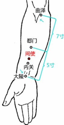 间使穴:属手厥阴心包经,位于前臂前区,腕掌侧远端横纹上3寸,掌长肌腱与桡侧腕屈肌腱之间。间使穴养心安神,治疗心悸失眠。快速取穴:微屈腕握拳,从腕横纹向上量4横指,两条索状筋之间即是间使穴。