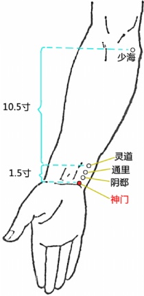 神门穴:属手少阴心经,在腕前区,腕掌侧远端横纹尺侧端,尺侧腕屈肌腱的桡侧缘。神门穴宁心安神,可治疗心烦失眠。快速取穴:微握掌,另手四指握住手腕,屈拇指,指甲尖所到凹陷处即是神门穴。