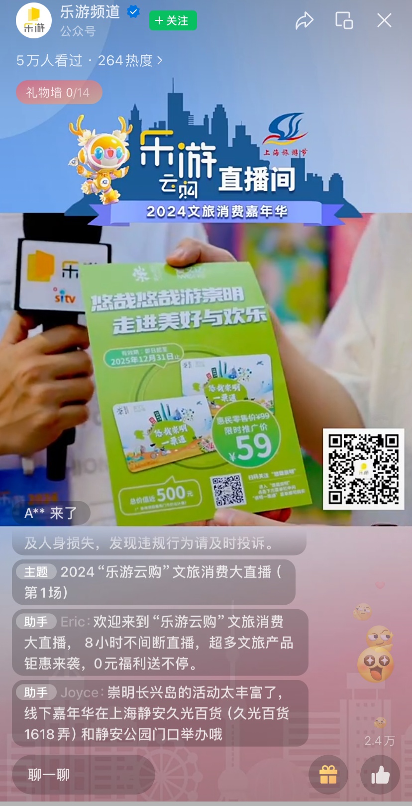 9月17日15:00,乐游云购文旅消费大直播在乐游电视频道、乐游频道视频号热力开播。以本次直播为契机,崇明文旅组织开展了崇明专场直播活动,上海城投长兴前卫、崇明生态旅游集团、爱文亿、海上花岛(前卫村)、崇明金茂凯悦酒店、崇明信澜天地云居酒店等企业精心策划打造了折扣优惠产品。