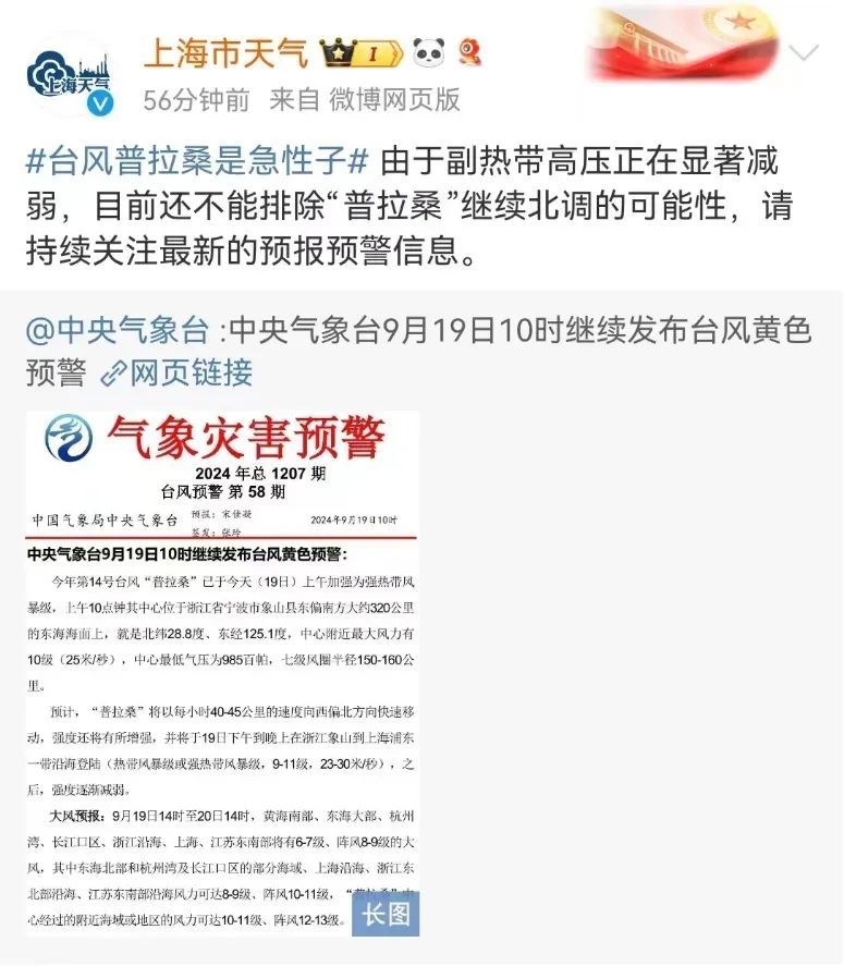 上海市气象局官方微博@上海市天气 转发@中央气象台 表示:由于副热带高压正在显著减弱,目前还不能排除“普拉桑”继续北调的可能性,请持续关注最新的预报预警信息。