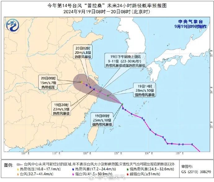 中央气象台今天(9月19日)10时继续发布台风黄色预警,预计,“普拉桑”将以每小时40-45公里的速度向西偏北方向快速移动,强度还将有所增强,并将于19日下午到晚上在浙江象山到上海浦东一带沿海登陆(热带风暴级或强热带风暴级,9-11级,23-30米/秒),之后,强度逐渐减弱。