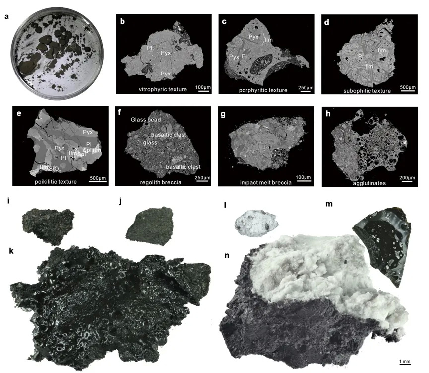研究发现,嫦娥六号采集的岩屑碎片主要由玄武岩、角砾岩、粘结岩、浅色岩石和玻璃质物质组成。其中,玄武岩碎片占总量的30%至40%,角砾岩和粘结岩由玄武岩碎屑、玻璃珠、玻璃碎片以及少量的斜长岩和苏长岩等浅色岩石碎屑物质构成,进一步揭示了样品来源的复杂性。
