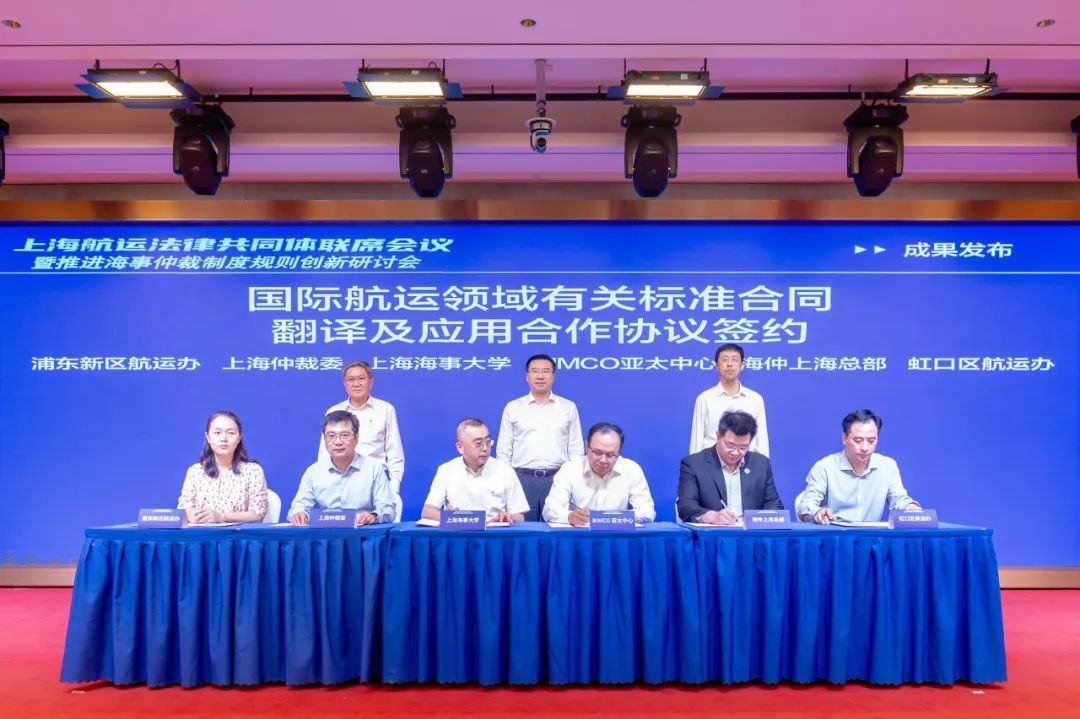 会上,上海海事大学、上海波罗的海国际航运公会亚太中心、中国海事仲裁委员会上海总部、上海仲裁委员会、浦东新区航运办、虹口区航运办等单位签署国际航运领域有关标准合同翻译及应用合作协议。市司法局、市高级人民法院、上海仲裁协会分别就上海市涉外商事海事临时仲裁推进办法、上海市“三特定”临时仲裁司法审查有关政策指引、临时仲裁规则进行解读。上海市律师协会成立航运专业法律服务团。浦东新区人民政府、虹口区人民政府、中国远洋海运集团有限公司、上海海事大学、上海航运保险协会等成员单位作交流发言。